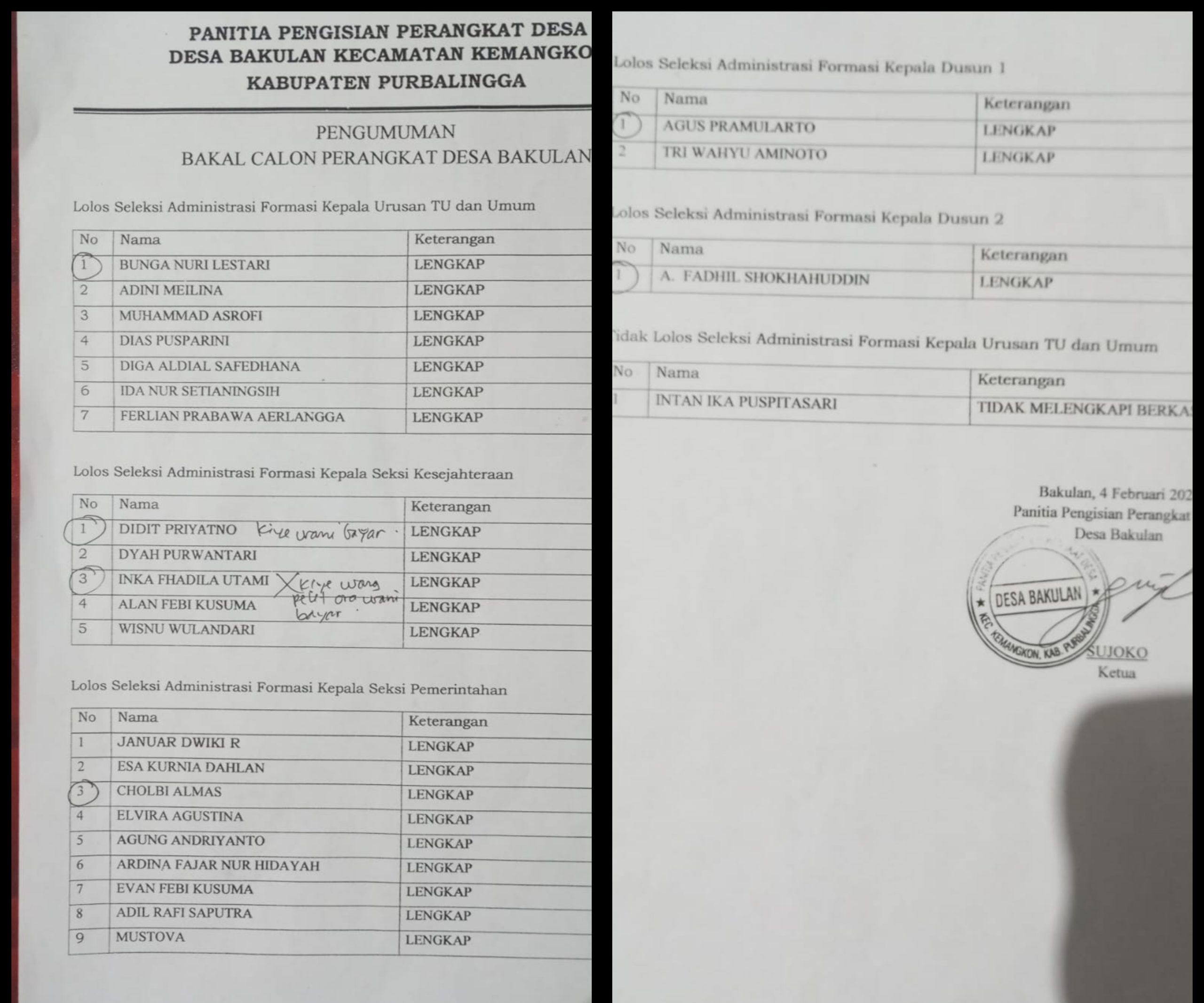 Purbalingga – Sejumlah dokumen yang disebut berasal dari kantor Desa Bakulan, Kecamatan Kemangkon, mulai beredar di tengah masyarakat. Dokumen tersebut memuat daftar nama peserta seleksi perangkat desa, lengkap dengan matriks penilaian serta tanda lingkaran pada beberapa nama tertentu.